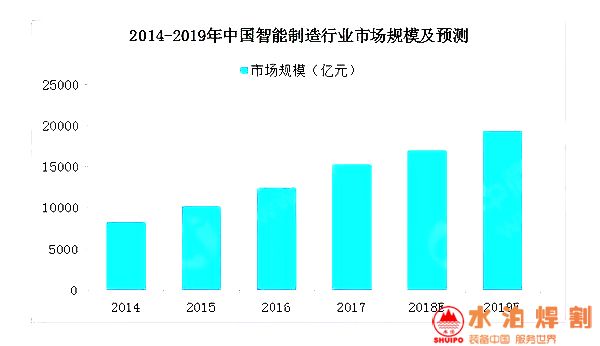 在國家政策推動,制造業(yè)技術(shù)轉(zhuǎn)型升級等背景下,中國智能制造產(chǎn)業(yè)發(fā)展迅速,對產(chǎn)業(yè)發(fā)展和分工格局帶來深刻影響。數(shù)據(jù)顯示,2017年中國智能制造行業(yè)市場規(guī)模為15150億元,增長率為22.6%,伴隨著技術(shù)的逐漸完善,應(yīng)用產(chǎn)業(yè)的不斷拓展,市場規(guī)模將持續(xù)增長,預(yù)計(jì)2019年市場規(guī)模將超19000億元。